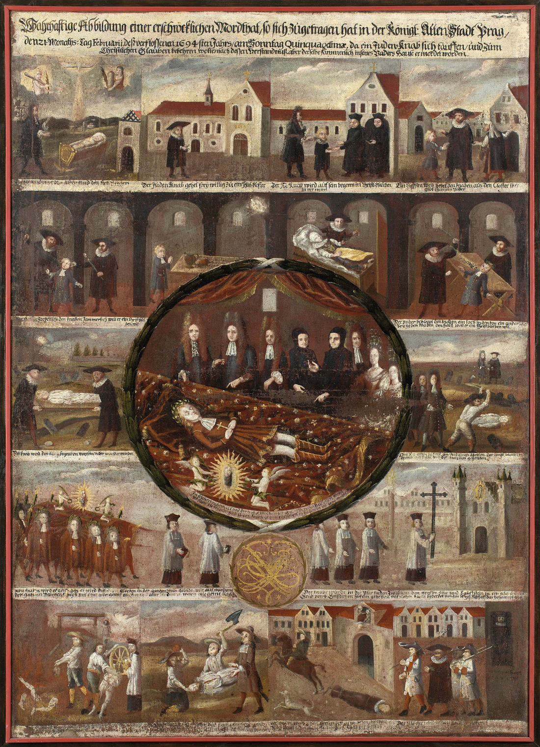 Z období raného novověku se dochovala vyobrazení, která měla Židy zesměšnit (obr. 4) nebo jim přisoudit nepřirozené až nelidské vlastnosti (například pití zvratků, obr. 7). Jiná díla měla Židy ukázat nejen jako pomýlené, ale i jako zásadně nepřátelské vůči křesťanskému náboženství. Židé byli vykreslováni jako ti, kdo ohrožovali rekatolizační úsilí o jednotu církve, onoho „mystického těla Kristova“. Zobrazení Židé páchali nejen symbolické násilí na proměněném těle Kristově při rituálním znesvěcení hostie (obr. 5), ale měli se údajně dopouštět přímo vraždění bohabojných křesťanů (obr. 1, 3). „Zavražděné křesťanské děti“ byly oslavovány jako mučedníci (obr. 2–3) a za vraždu měli nést zodpovědnost kromě samotných vrahů také kolektivně všichni Židé. Umělecká díla pak měla být věčnou připomínkou důvodu, proč byli Židé z daného města vyhnáni (obr. 1, 10). Židé neměli podle tehdejšího názoru zasluhovat nic jiného než násilí (obr. 8) a definitivní porážku od „církve vítězné“ (obr. 6).